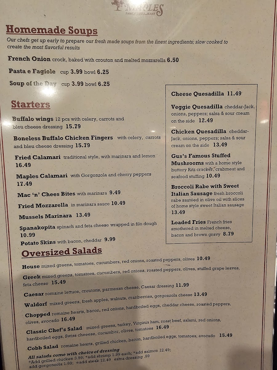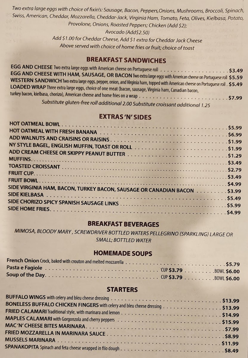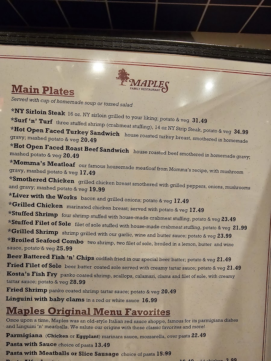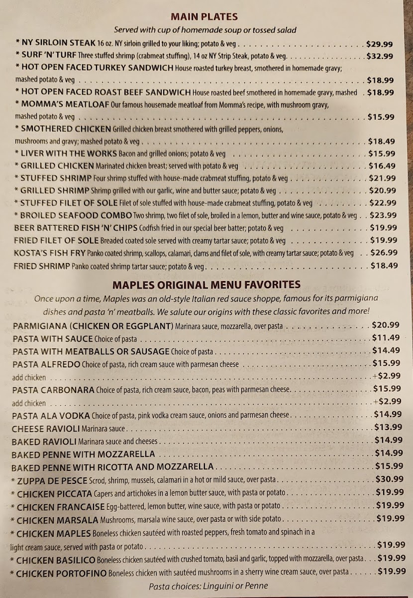 The menu at Maples Family Restaurant offers a straightforward, comforting selection that blends classic American diner favorites with Italian family-style dishes. It’s the kind of place where you can start your day with hearty omelettes and soups, or enjoy casual, satisfying grinders and pasta at any time. The menu is designed to appeal to all ages, making it well-suited to family gatherings, relaxed lunches, or casual dinners.