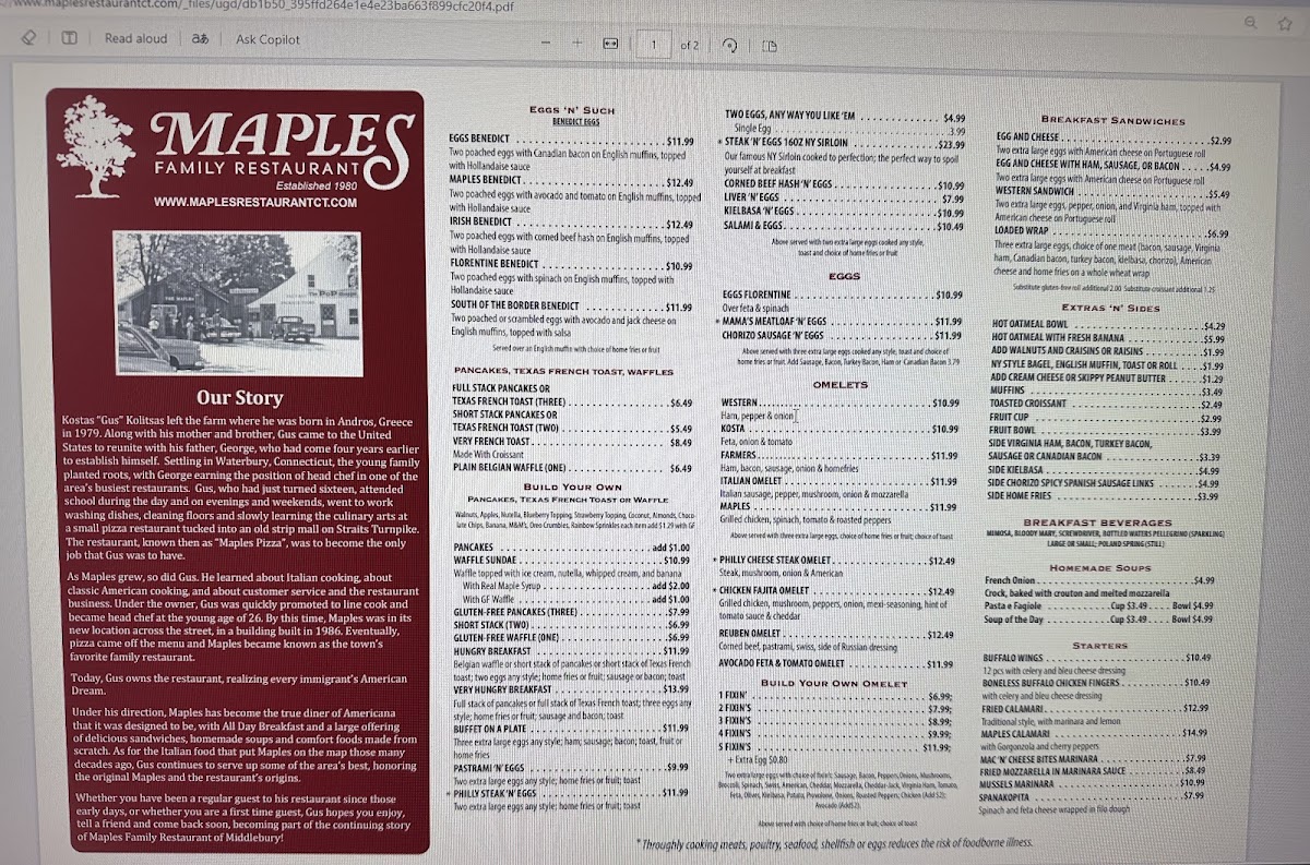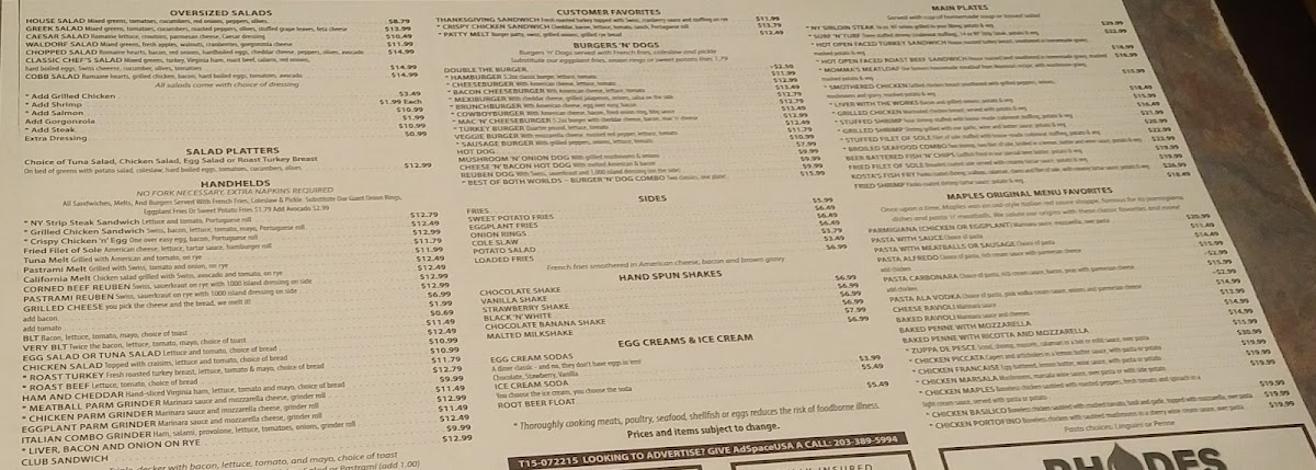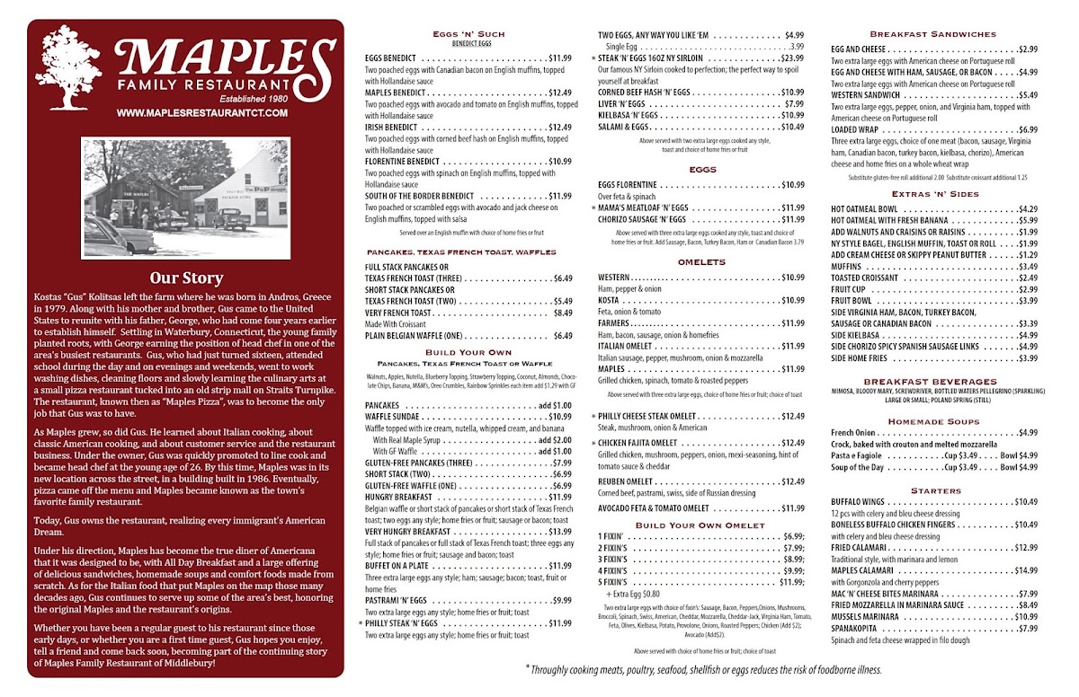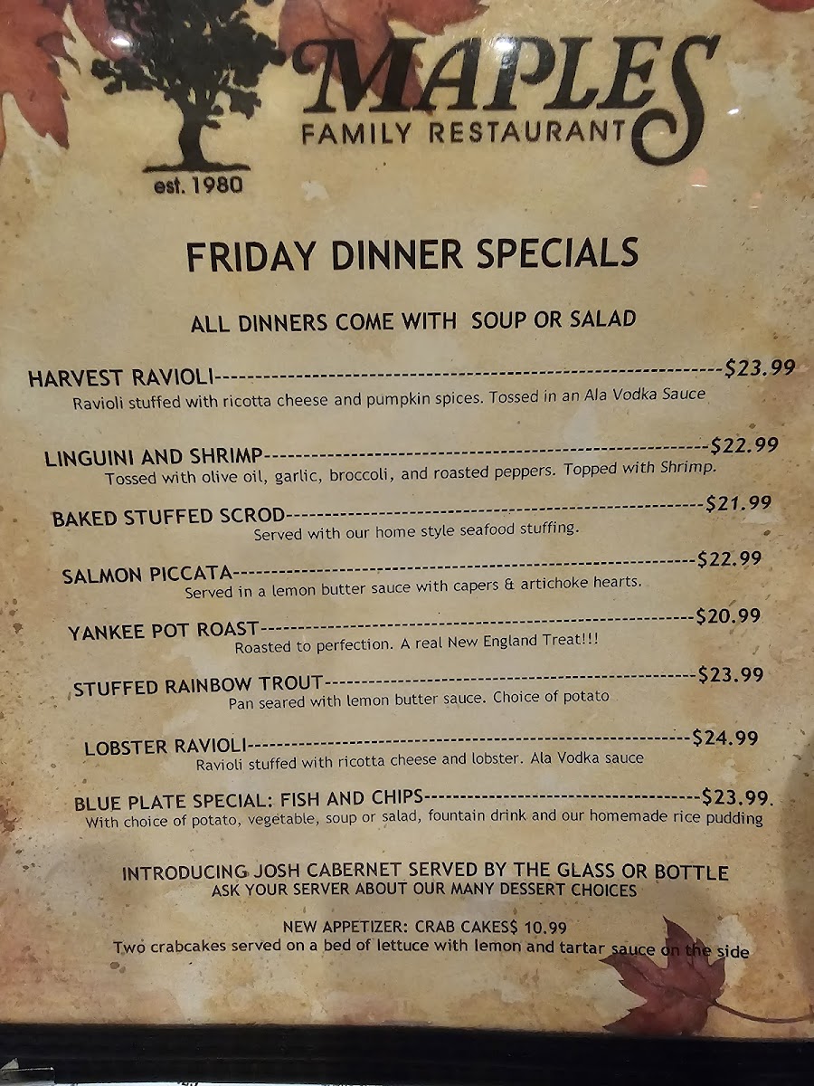 The menu at Maples Family Restaurant offers a straightforward, comforting selection that blends classic American diner favorites with Italian family-style dishes. It’s the kind of place where you can start your day with hearty omelettes and soups, or enjoy casual, satisfying grinders and pasta at any time. The menu is designed to appeal to all ages, making it well-suited to family gatherings, relaxed lunches, or casual dinners.