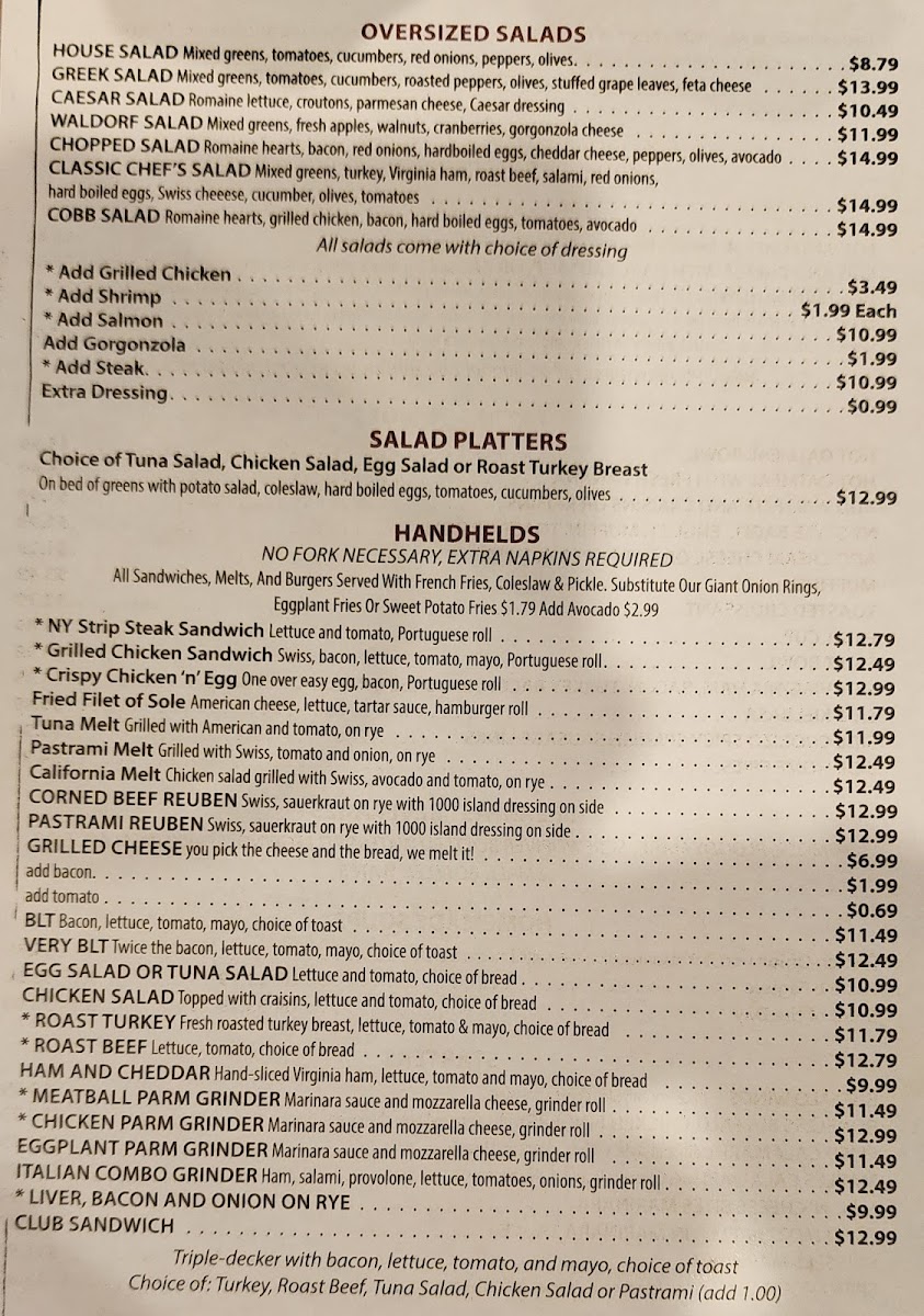 Breakfast fare includes a variety of omelettes and traditional sides like homefries and toast, giving a warm, familiar start to your morning. Soups such as French Onion and Pasta E Fagioli offer gentle flavors that complement the homey atmosphere, perfect for a cozy midday meal. The grinder sandwiches range from grilled chicken to classic roast beef, providing generously sized portions that match the welcoming, unhurried vibe of the restaurant.